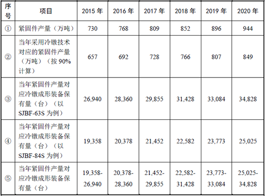 冷鐓成形裝備年度市場需求與當年緊固件生產情況密切相關,可以依據我國緊固件的產量對用于生產緊固件的冷鐓成形裝備市場容量作出估算,下表簡單測算